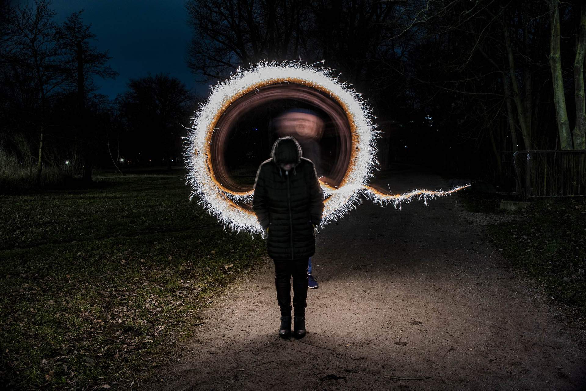 - Stahlwolle-Lightpainting: Brennende Stahlwolle erzeugt funkelnde, feurige Muster.
